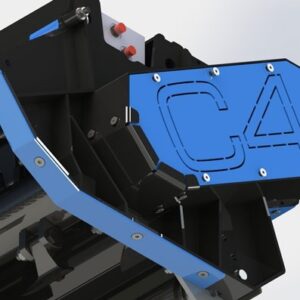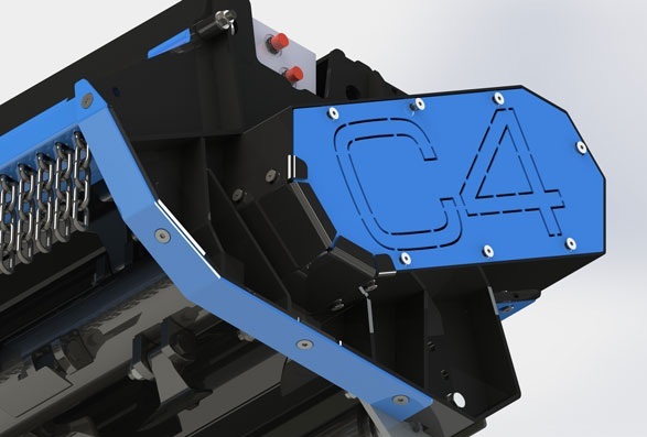 Protection avant avec chaînes, réglable sur deux positions pour un entretien facile.