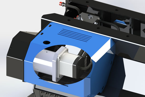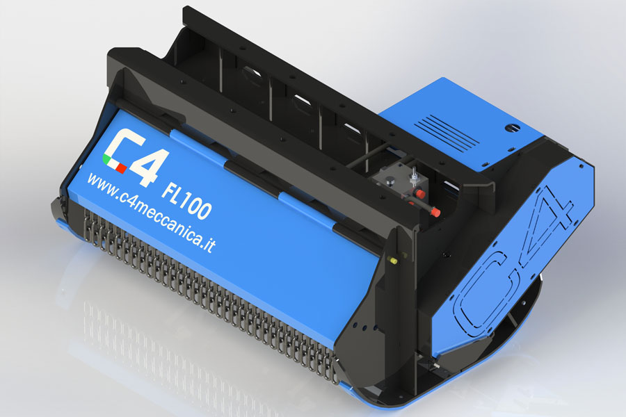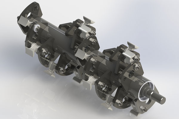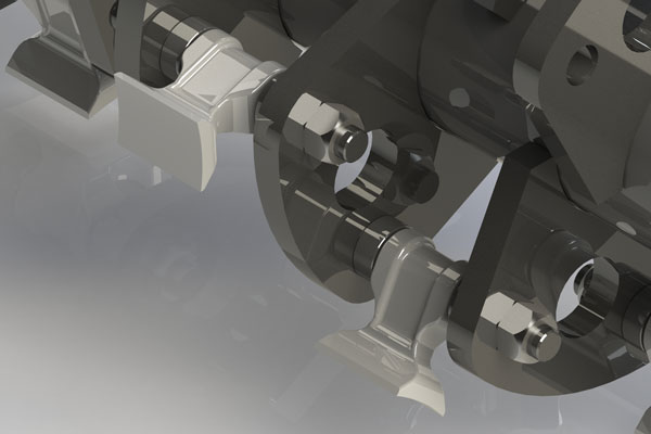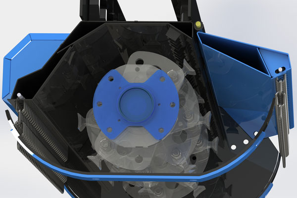 Rotor met intrekbare hamers, in open configuratie, voor gewichtsvermindering en grotere snij-efficiëntie. Hamersteunen helpen meer werveling in de behuizing te genereren, wat de recirculatie van materiaal en een grotere mulchwerking bevordert.